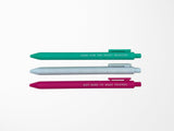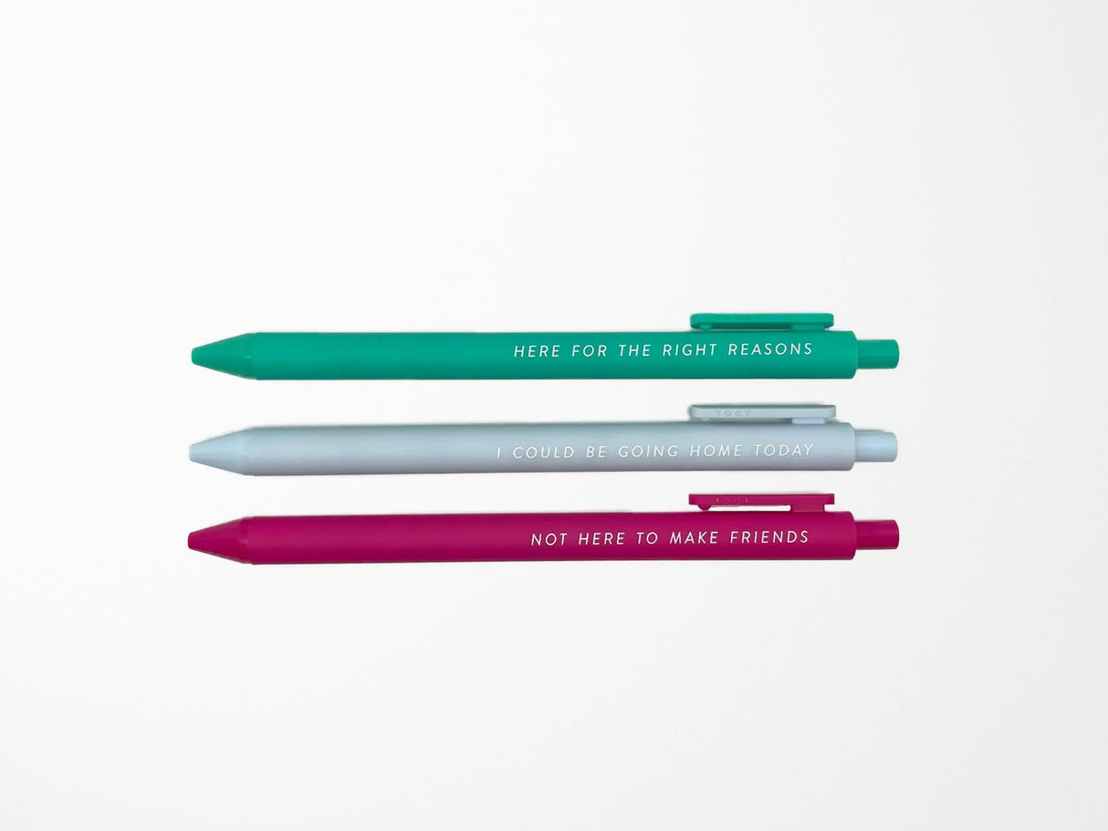 Gonna use these pens to pay the bills and take care of business. This set of three ballpoint pens should fit the bill. Printed with phrases that poke gentle fun.
