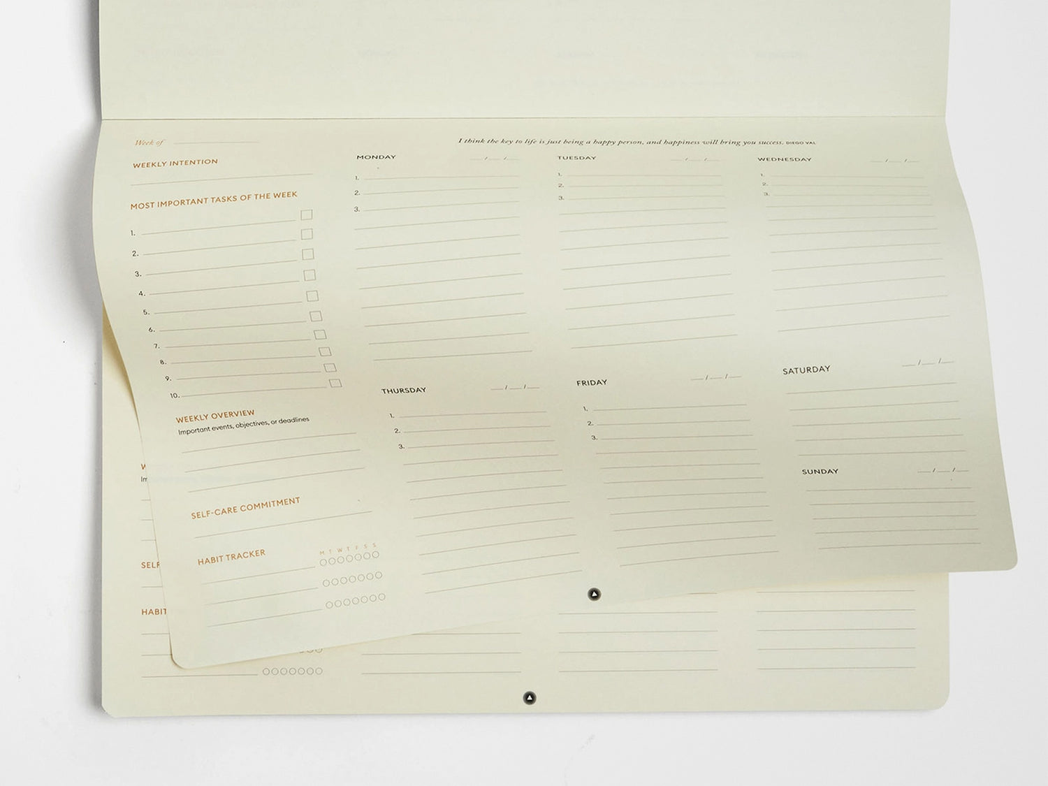 Introducing flexible planning system for those who don’t plan. Productivity Weekly Desk Pad allows you to balance your professional and personal commitments by setting your intentions, scheduling weekly priorities, organizing your important tasks, and keeping track of your habits.