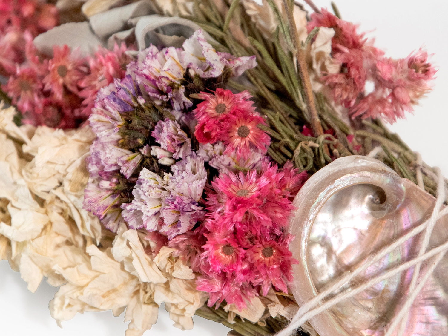 Using naturally harvested white and pink wildflowers, with a shell tied to the stem, we made this lovely statement smudge stick, when white sage by itself just won't do.