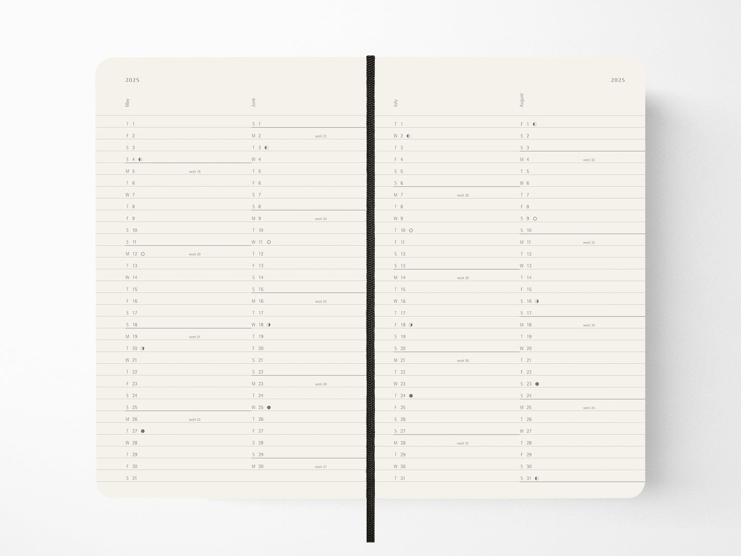 Dated from January to December 2025, this planner gives you a month-to-view across two pages. Each monthly overview is followed by 2 ruled pages for notes, to-do lists and random thoughts. Ideal for anyone who loves to step back and see the bigger picture each month, this planner is a great way to keep track of long-term plans as well as daily appointments.