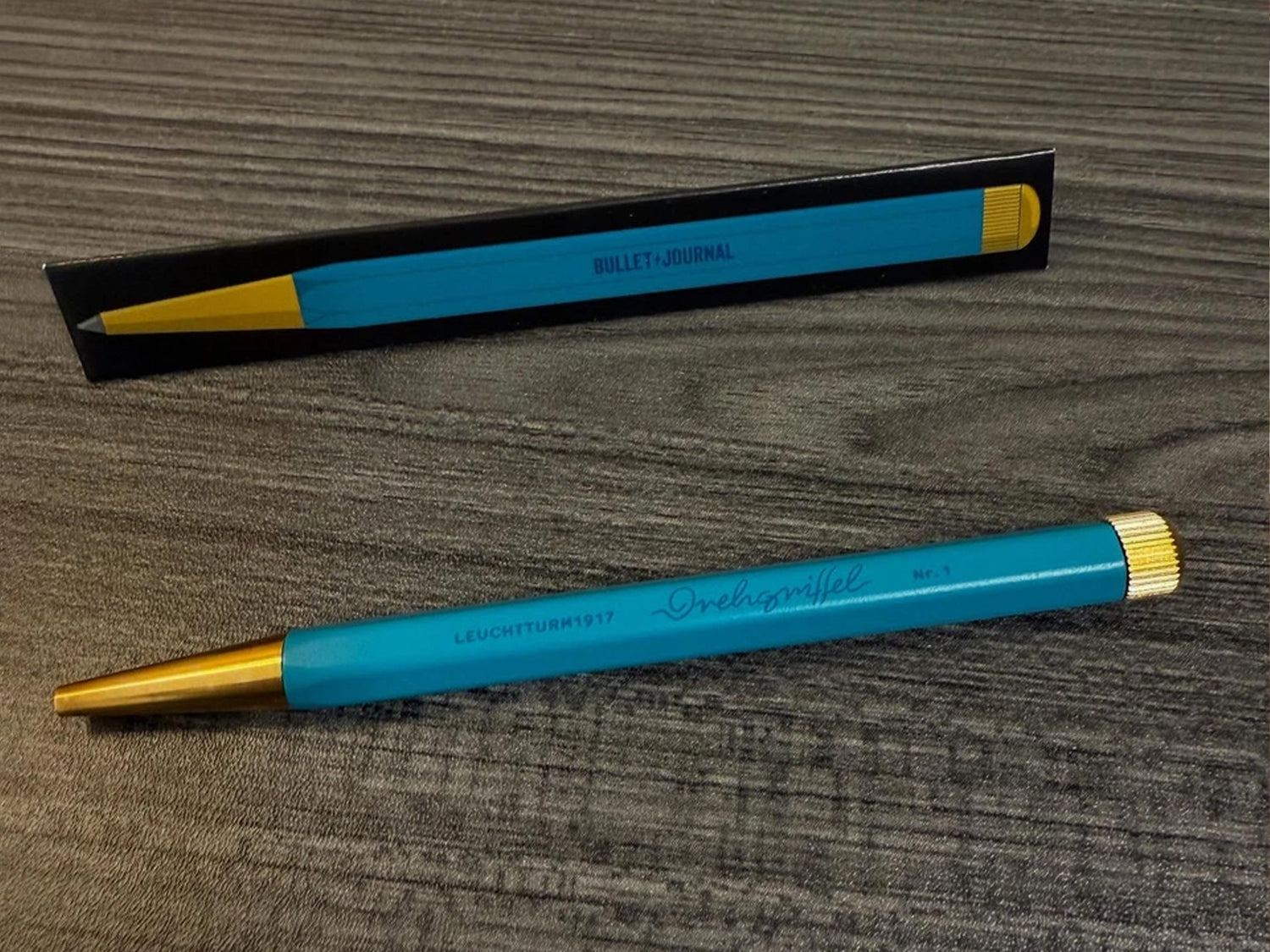 The pen body is made from precision-milled aluminum and brass in a hexagonal shape with a knurled twist at the end that accents the matte turquoise body. Bullet Journal logo on the side, with a lightning bolt logo on the endcap. This pen feels great in your hand!