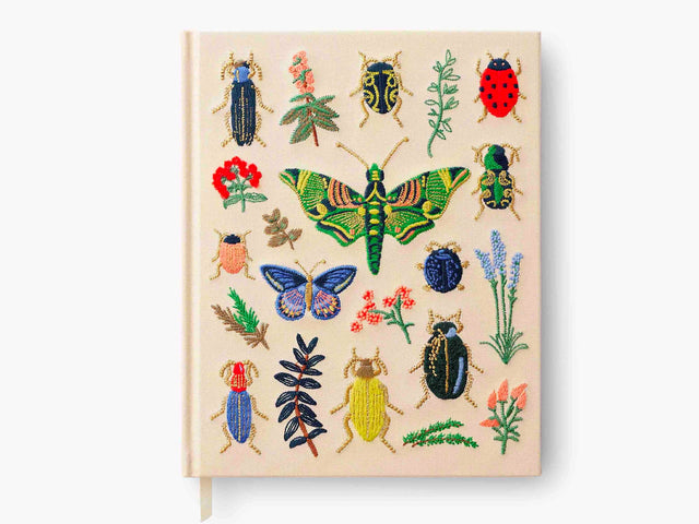 Our embroidered sketchbook is a large, hardcover journal with 108 unlined pages of thick paper perfect for sketching, drawing, and journaling. The cover is wrapped in cream book cloth and embroidered with the beetles and bugs of our Curio print with metallic gold accents. An attached grosgrain ribbon bookmark will save your place.
