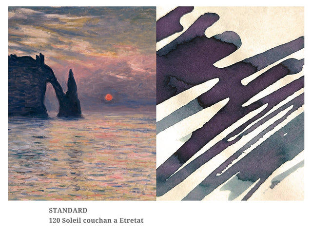 "Soleil Couchant à Etretat" is inspired by Claude Monet's paintings of Etretat, capturing light as a master of impressionism.