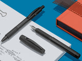 This Essentio Aluminum Black fountain pen is beautiful to look at, comfortable to hold and a pleasure to write with. Barrel made of brushed aluminum with a ribbed grip zone. Metal clip on the cap is spring-loaded. Cap pulls off and posts on the back end when writing. High-quality stainless steel nib M (medium). Cartridge/converter system. Equipped with one blue ink cartridge. Converter sold separately. Packaged in attractive white linen gift box.