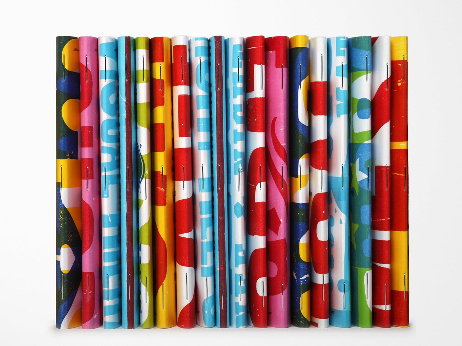 The covers are on Domtar Cougar 100-lb white cover stock with a brute-force application of a variety of hand-mixed Kennedy oil-based inks. The body pages are ruled in light blue on a smooth 60-lb text stock from Finch.