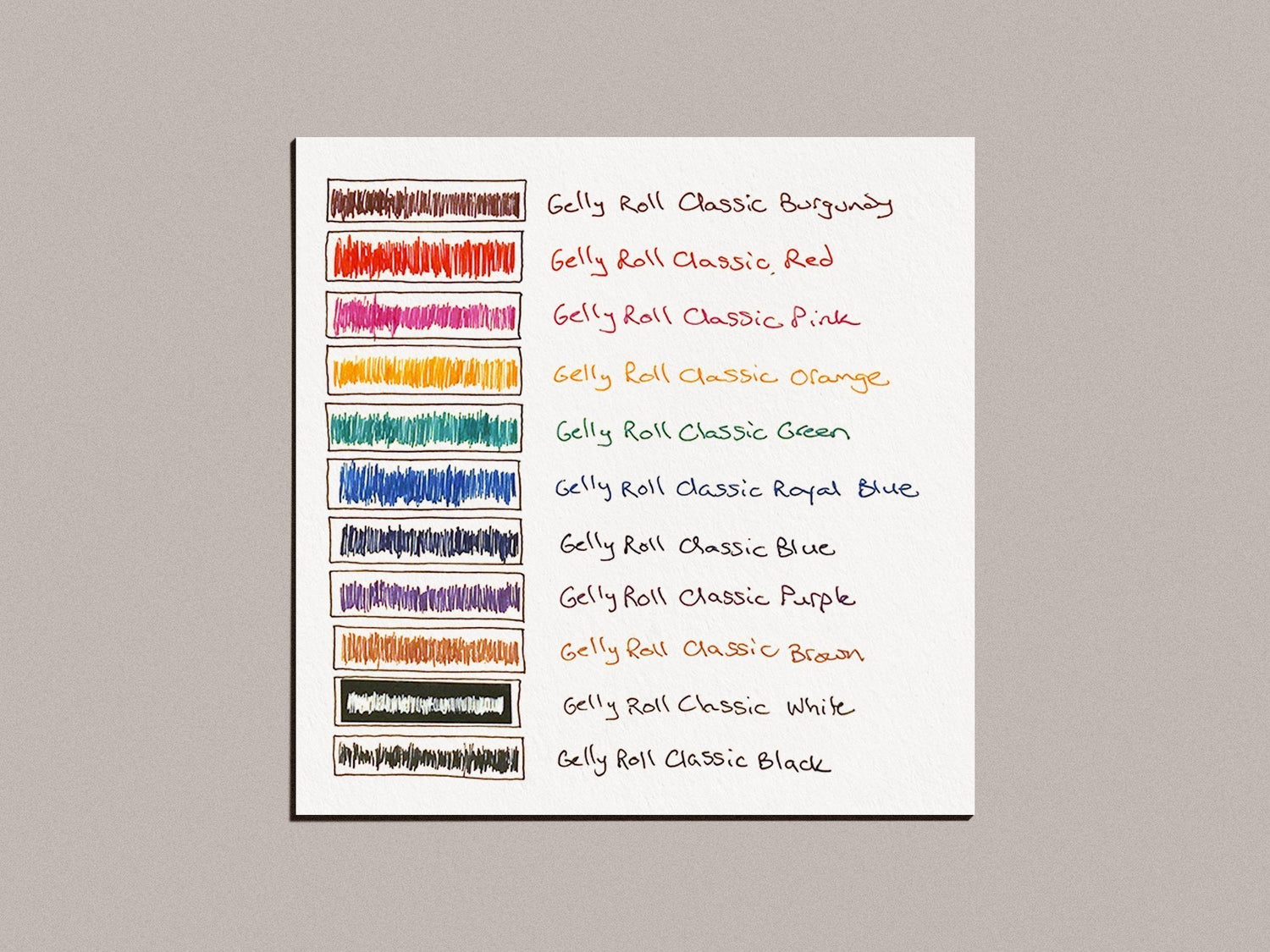 These creamy, colorful Gelly Roll gel ink pens will be your favorite flavor for letting thoughts flow onto paper. This gel ink is archival, waterproof, fade-resistant, and chemical-proof, so it is ideal for checks, legal documents, scrapbooks, and anything where permanence is important.