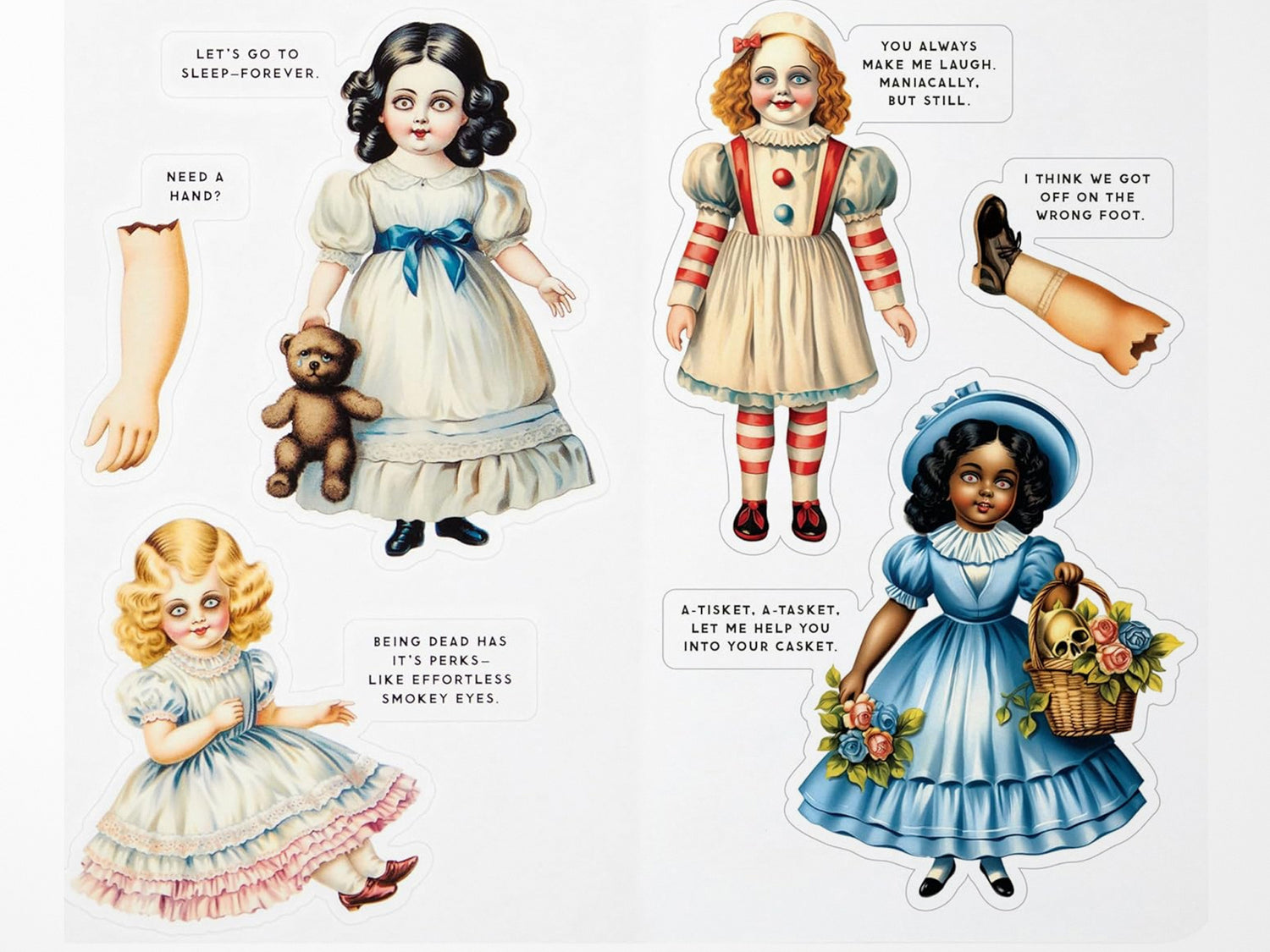 18 Pages of Traditional Vintage Inspired Haunted Doll Stickers and 2 Pages of Puffy Stickers. These little haunted dolls can do what you can’t–add a touch of morbid fun to daily life. Oh, and see dead people or whatever. They are perfect to give your friends, coworkers, or the occasional waiter/ghost.