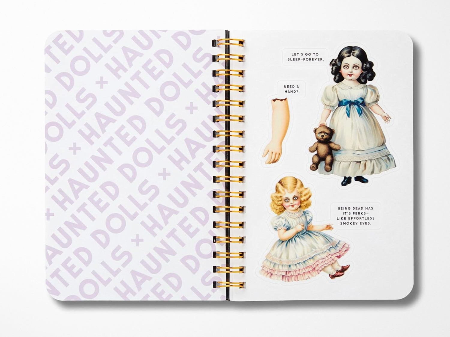 The Haunted Dolls Sticker Book rounds up a wide range of haunted dolls–with clever comments. Book contains approximately 60 oversize stickers to peel and stick anywhere.