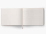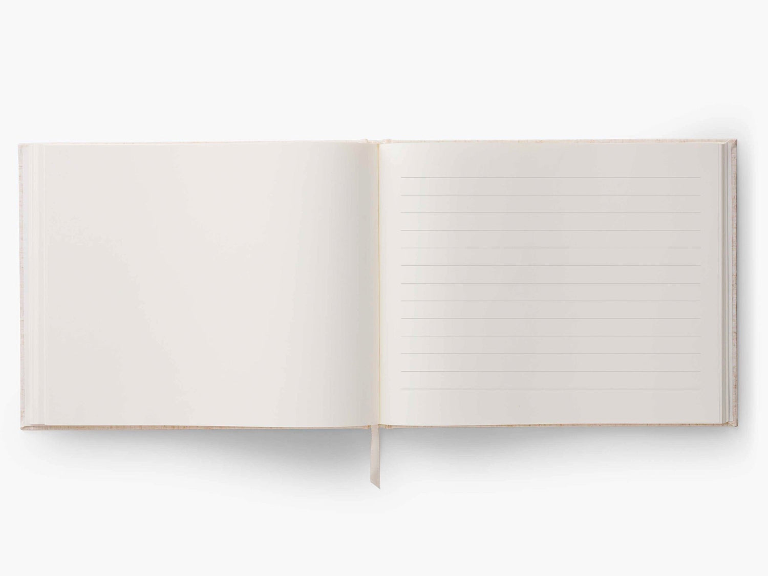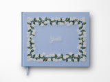 The embroidered guest book is a large hardcover book with 144 interior pages, half lined and half blank so guests can write a note, add a sketch, or paste in a photo to create a one-of-a-kind keepsake. The cover is wrapped in book cloth and embroidered with delicate blue Hydrangea florals and metallic gold accents. As a finishing touch, a grosgrain ribbon bookmark will save your place. The perfect “something blue” for weddings, events, and guest rooms alike.