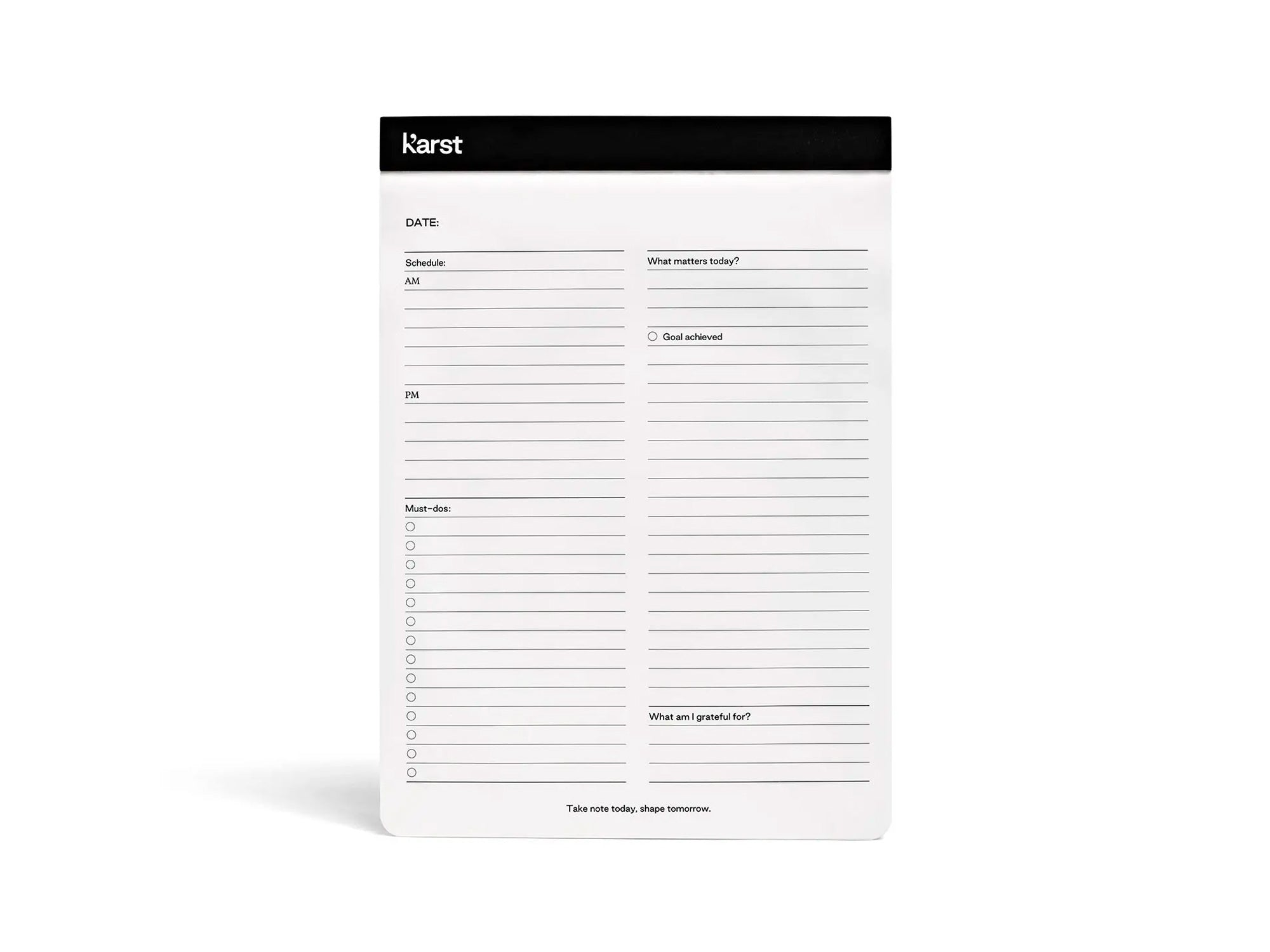 Meetings and your top goal for the day stay top of mind. Ample room for other important tasks and notes that pop up throughout the day. A space for a small moment of reflection to acknowledge the dayβs wins. A simple, functional layout to keep your focus on what matters most.