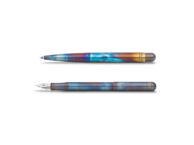 The smooth cylinder body of these diminutive writing instruments is stainless steel, blued by hand using a heat anodization technique. Each one is unique.
