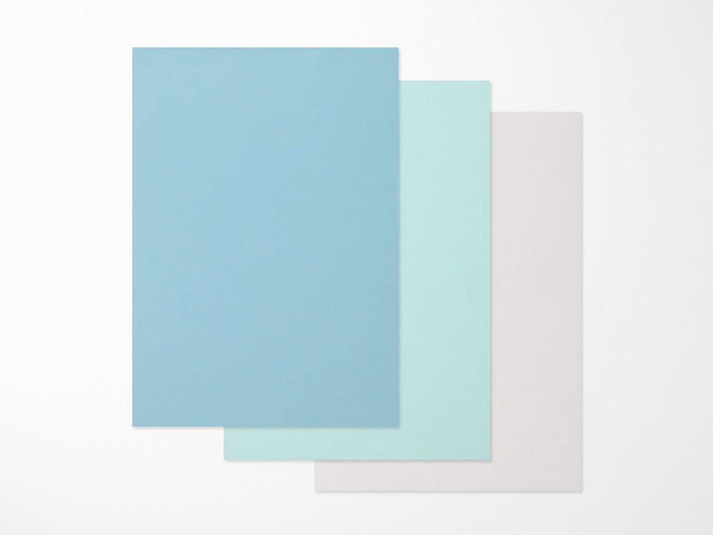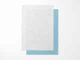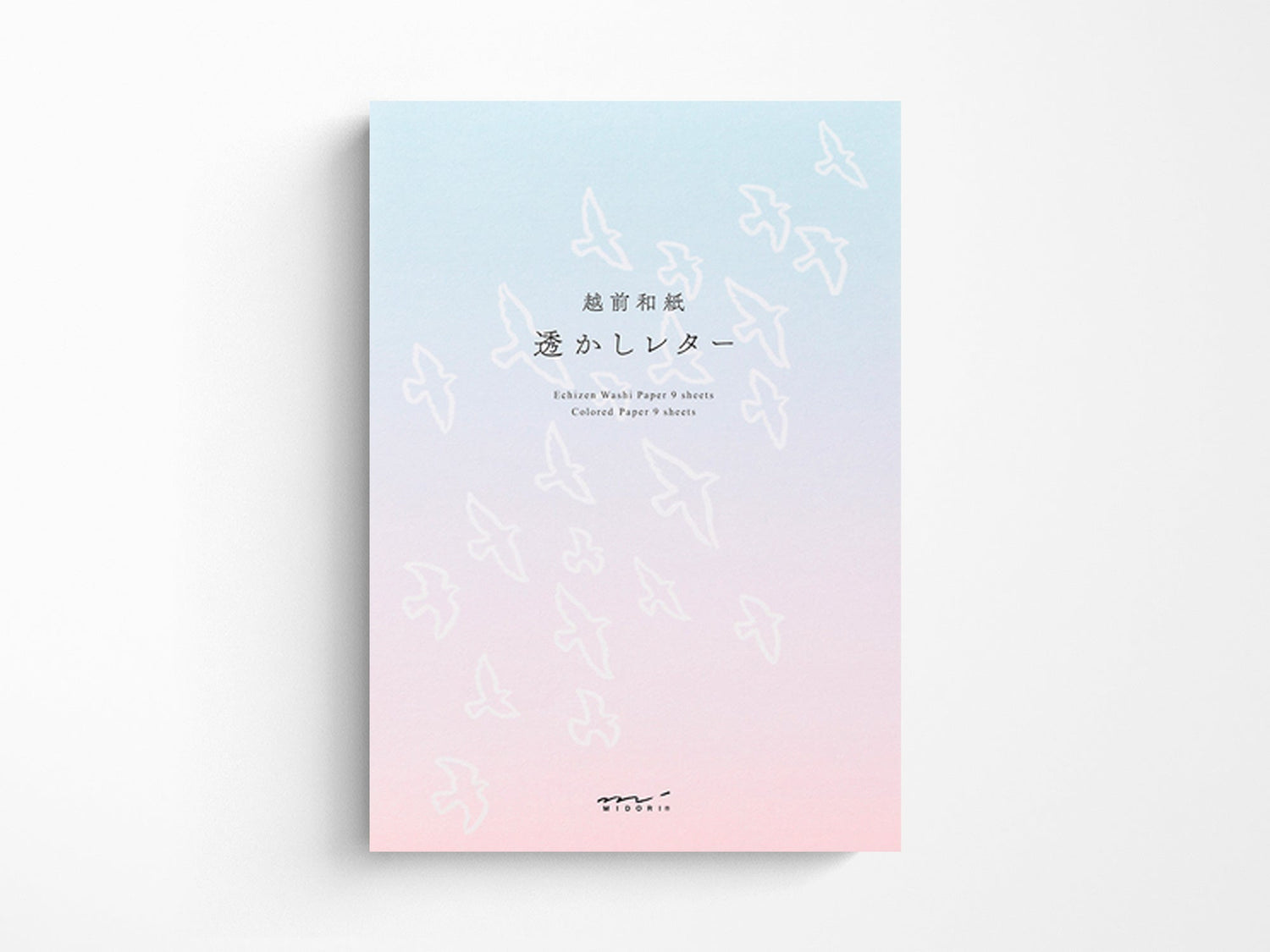 Watermark letter writing paper with a birds design that is revealed when colored paper is layered behind. The bird motif symbolizes freedom, creativity, and good luck. The delicate colors are pure and restful.
