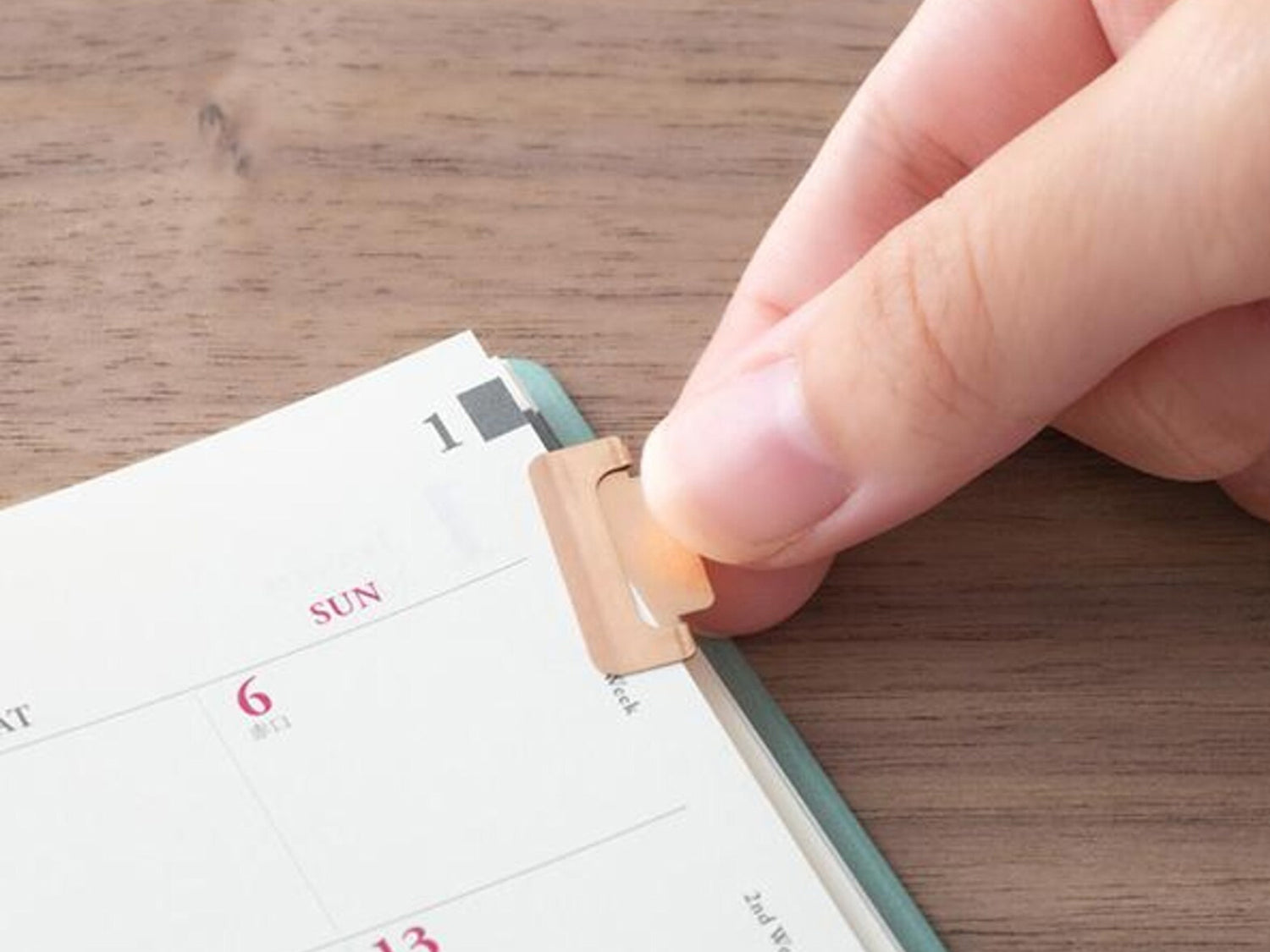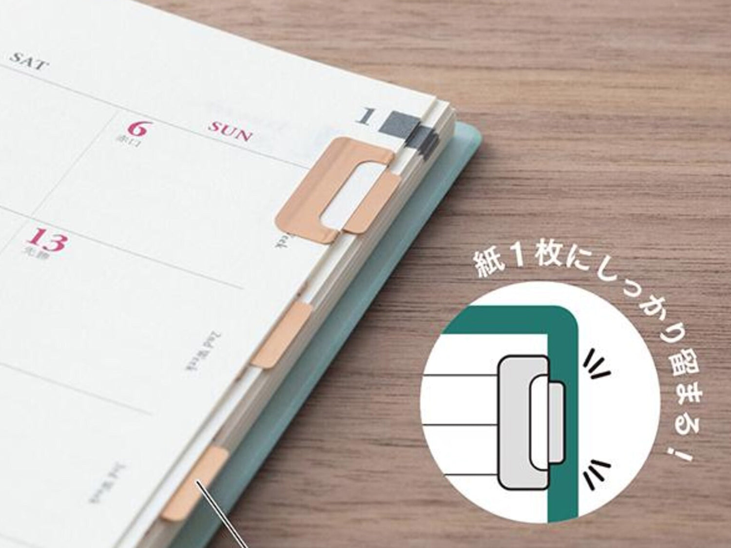 Midori Chiratto clips hold firmly to a single sheet of paper. They are made of extremely thin metal to mark your page in a planner or notebook. The simple design can be used either horizontally or vertically.