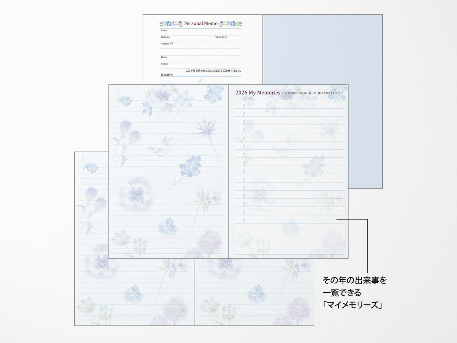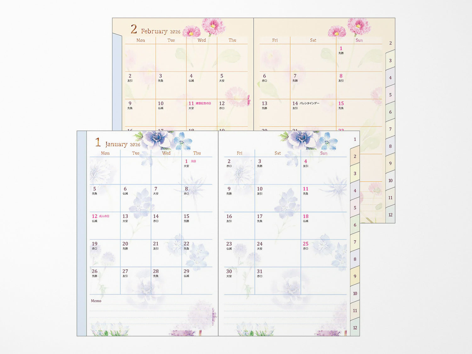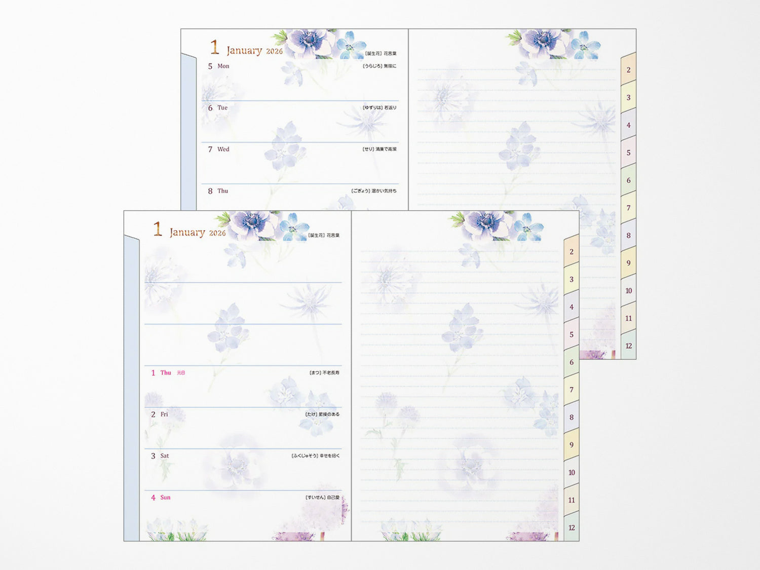 The Midori 2026 Pocket Diary B6 - Coountry Time Flower is a pocket-sized diary with a weekly and monthly layout, dated January 2026 – March 2027. The pages feature seasonal floral illustrations by Takako Kuriowa.