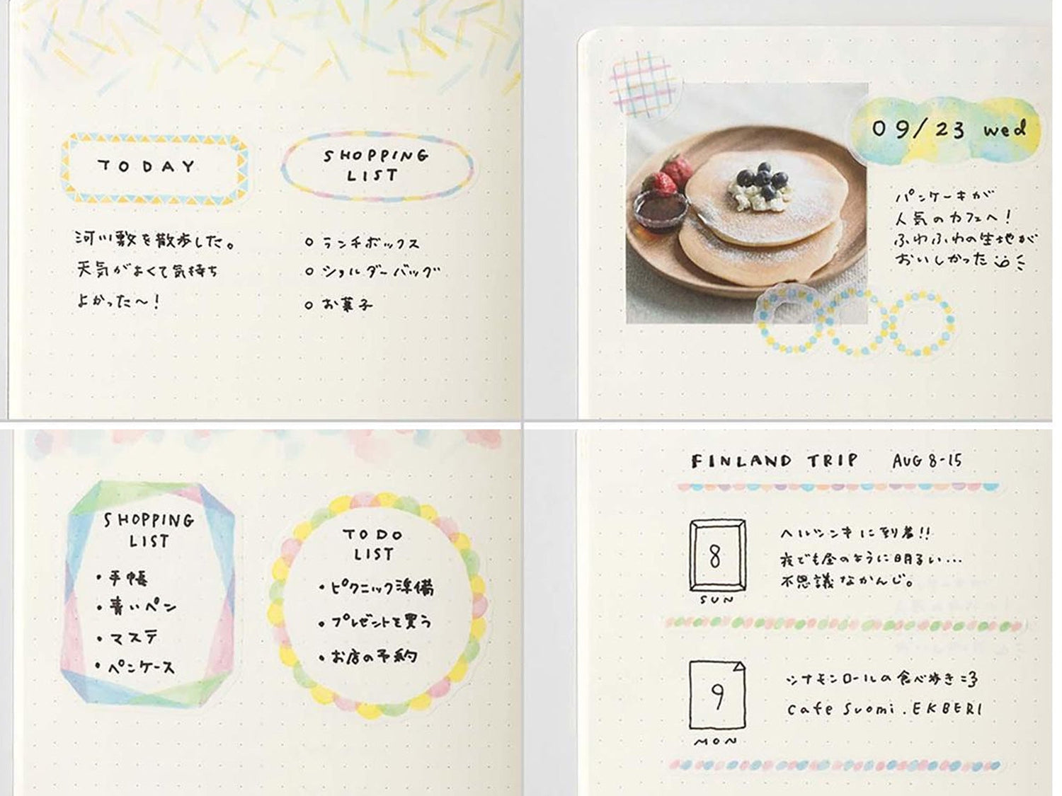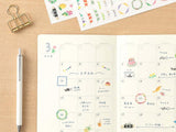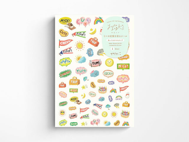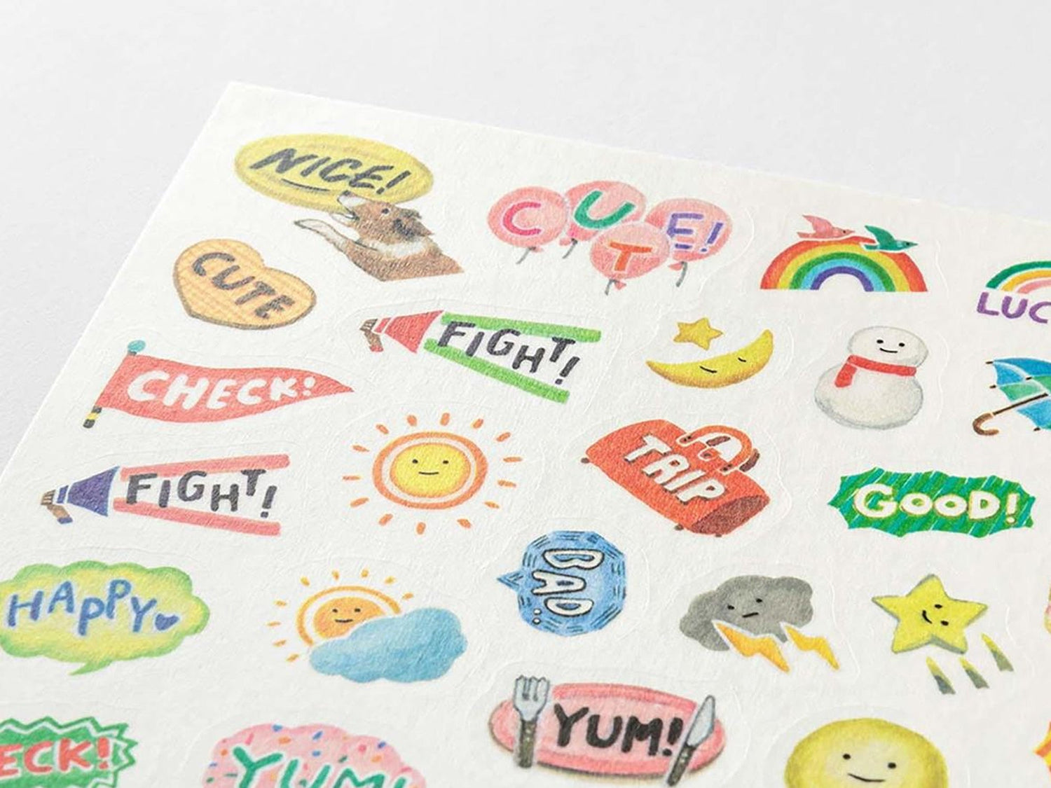 Stickers for Midori Yuru Log. Yuru Log is a new notebook series developed so that anyone can easily relax, have fun, and continue writing their daily records. These stickers are not only for decoration, but can also be written on with water-based pens thanks to a special coating applied to the surface of the Japanese paper.