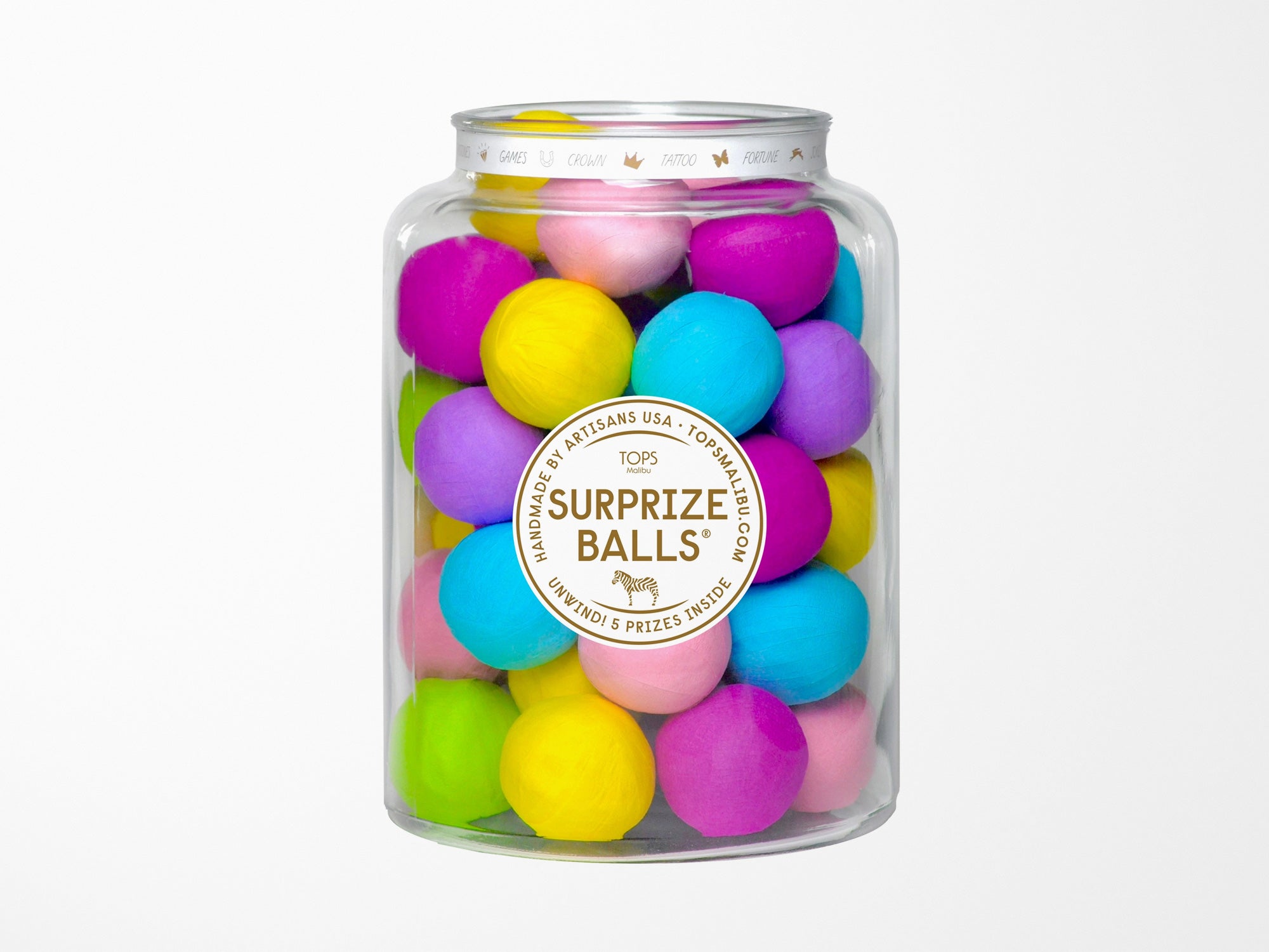 Surprises vary by style and include: gemstones, crystal, vintage-inspired toy, charm, sweet, crown, temporary tattoo, confetti popper, riddles, your good fortune and more. TOPS Malibu is the creator of the original Surprize Ball®. They are handcrafted by skilled artisans in the USA, making each one a personal and unique piece.