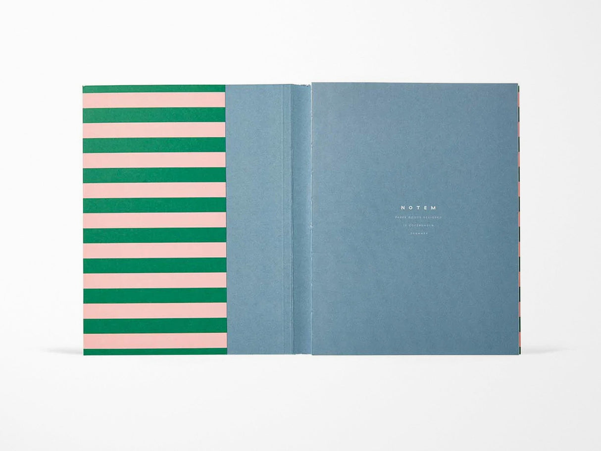 The notebook is stitched along the spine so when opened, it presents a perfectly flat surface, with a seamless transition between left and right.
