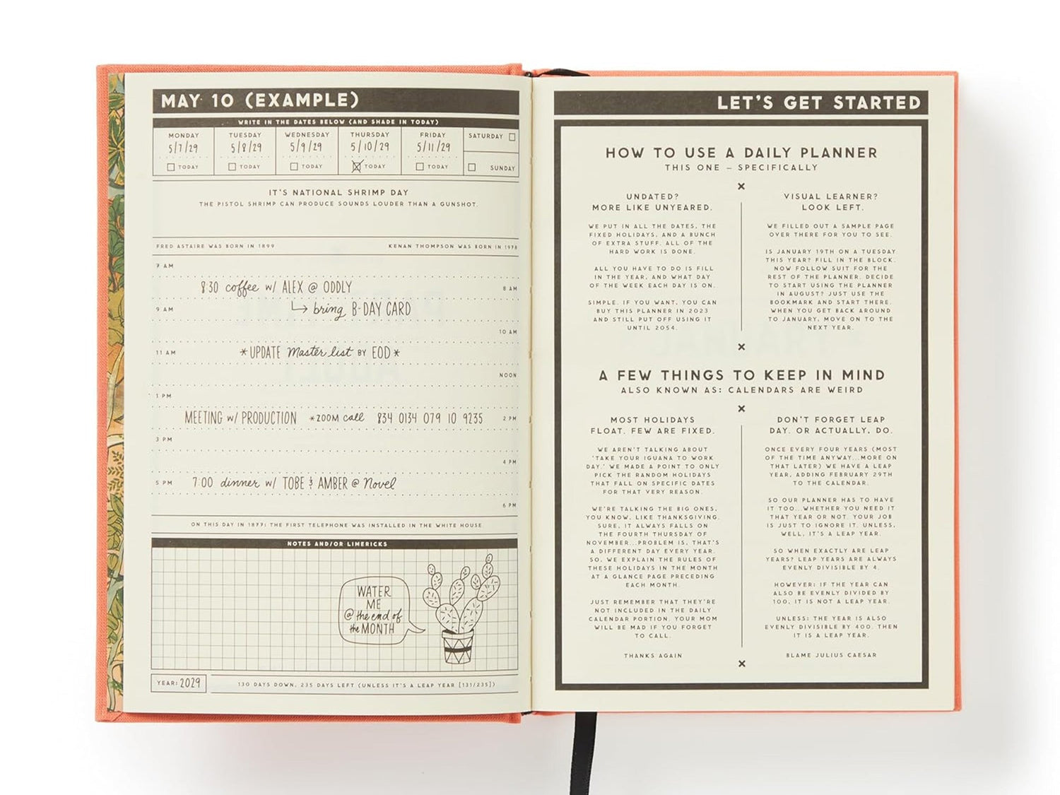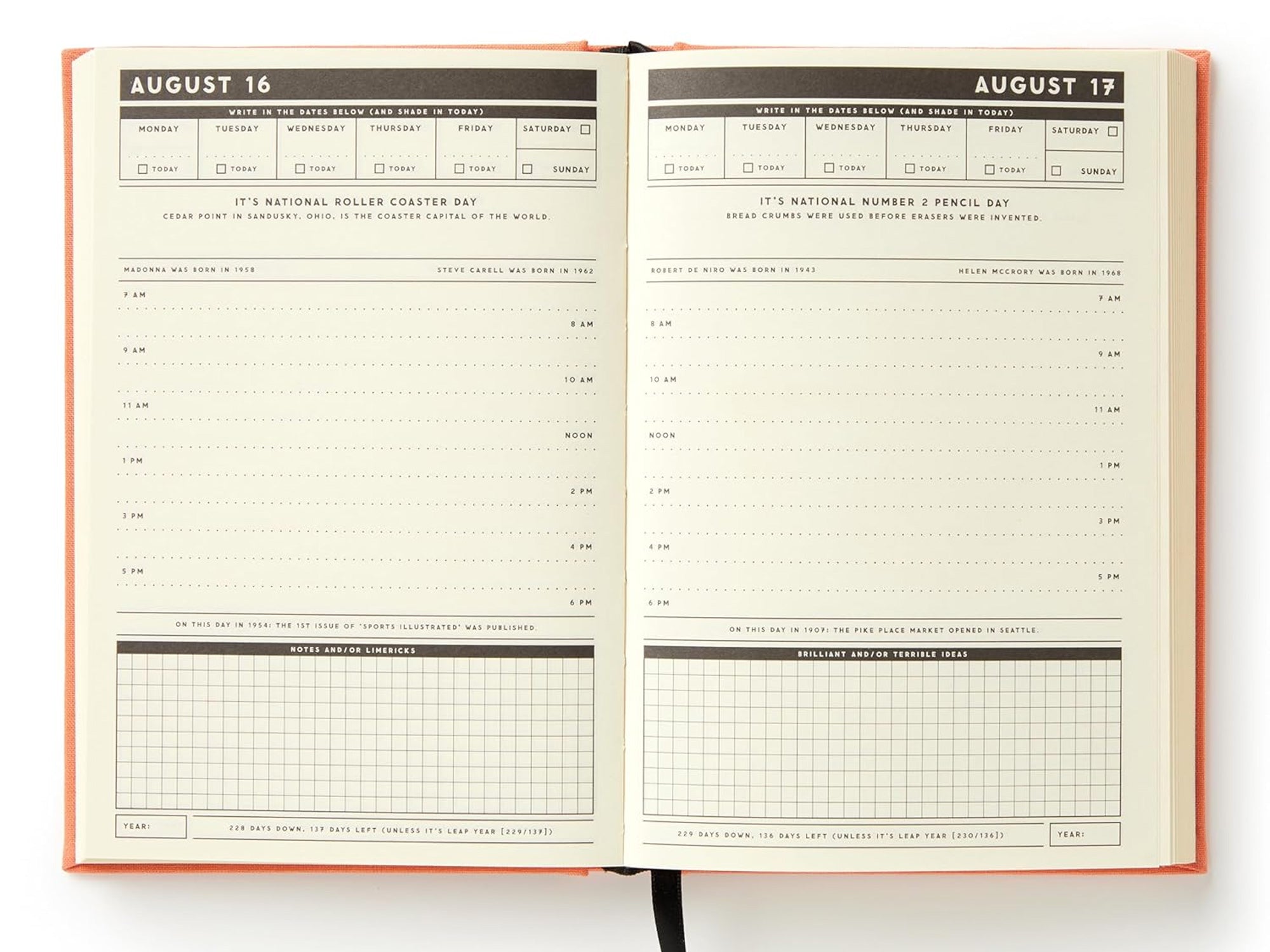 In this daily planner, each day gets a full page of real estate–it’s the perfect combination of a planner, journal, and that weird friend that knows the most random facts imaginable. Sure, it’s technically undated–but really, it’s more like 'un-yeared.’ See, we did all of the hard work for you. We've already put in all of the dates, the fixed holidays, and tons of extra stuff like daily random holidays, celebrity birthdays, and other bits of trivia. Just mark what day of the week it is, and you’re ready to go.