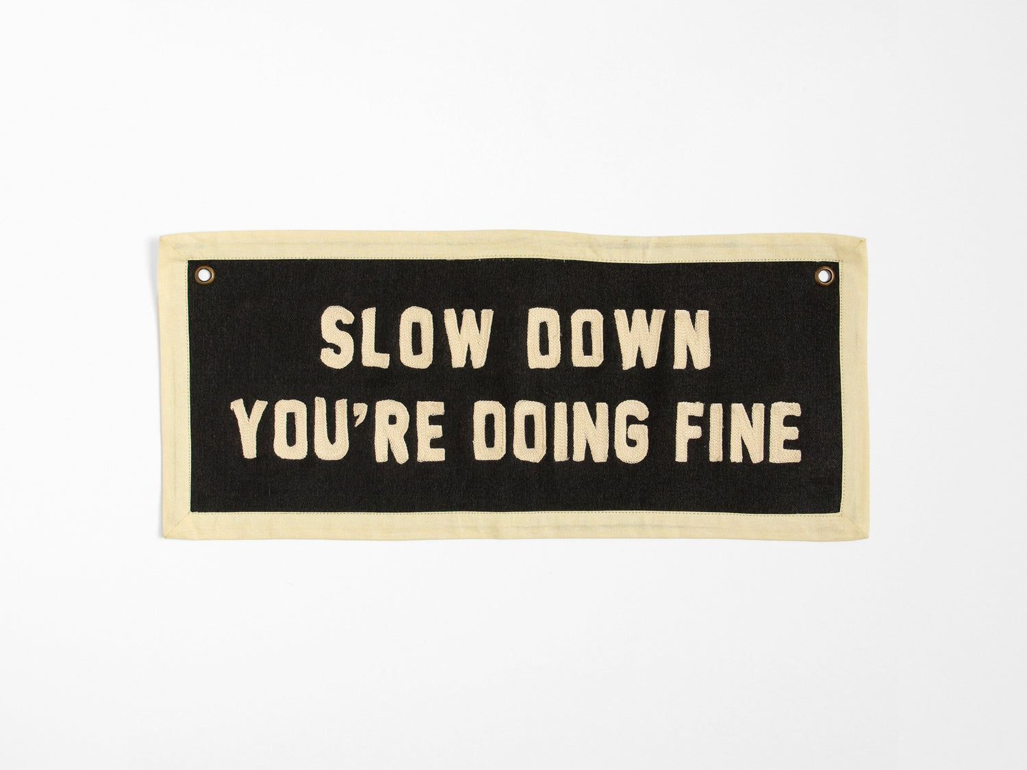 The Slow Down Embroidered Canvas Banner is your gentle daily reminder to take a breath and trust the process. With bold white lettering on a black canvas backdrop, this embroidered wall banner makes a statement while keeping things calm. Grommeted corners make it easy to hang in your office, bedroom, or studio space.