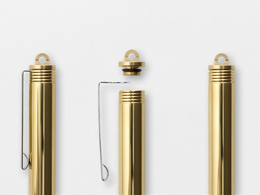 Easily converted into a compact “carry around” size and elongated for easy writing, BRASS FOUNTAIN PEN also boasts a depth in texture that solid brass acquires over time and use, complemented with a high-quality finish created by skilled Japanese craftsmen. The top of the pen has a ring for attaching a hook or string, so you can clip it to your bag as a key holder or customize it using beads and other items – let your imagination run free! The ring can also be removed for a clip-free pen if you prefer. You can put it on TRAVELER’S notebook Pen Holder. or just put in your pocket.