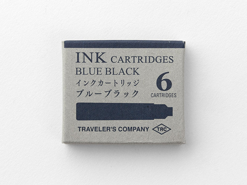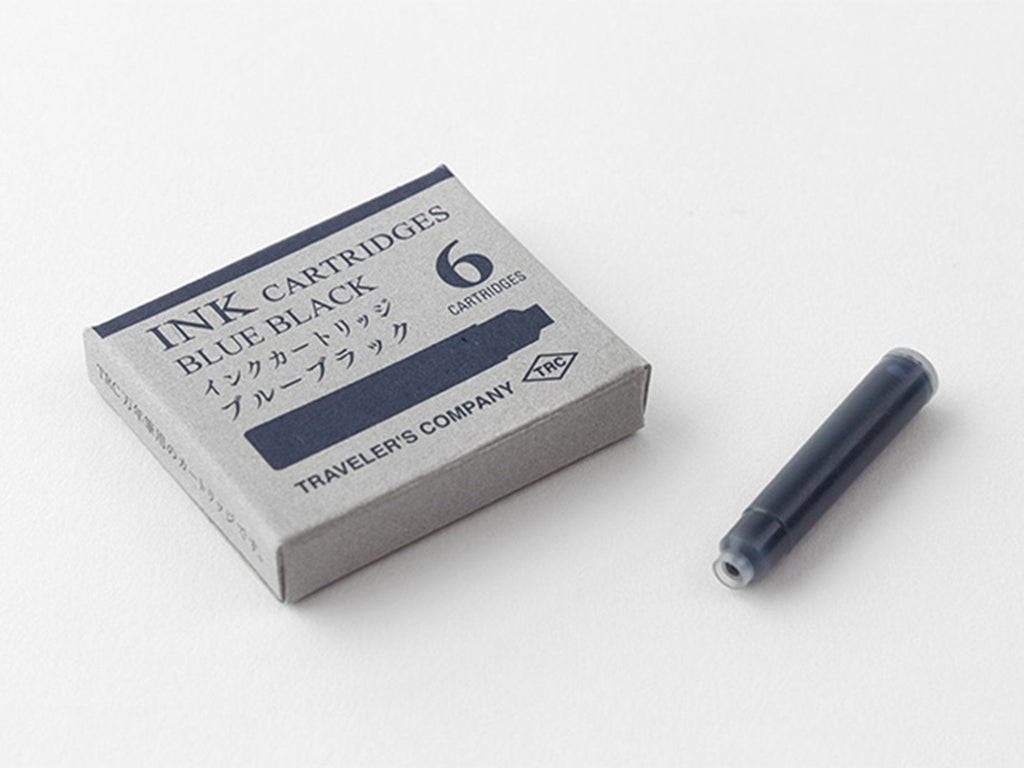 Box of 6 ink cartridges for the Traveler's Company Brass Fountain Pen. Universal / European size. Choose black or blue ink.