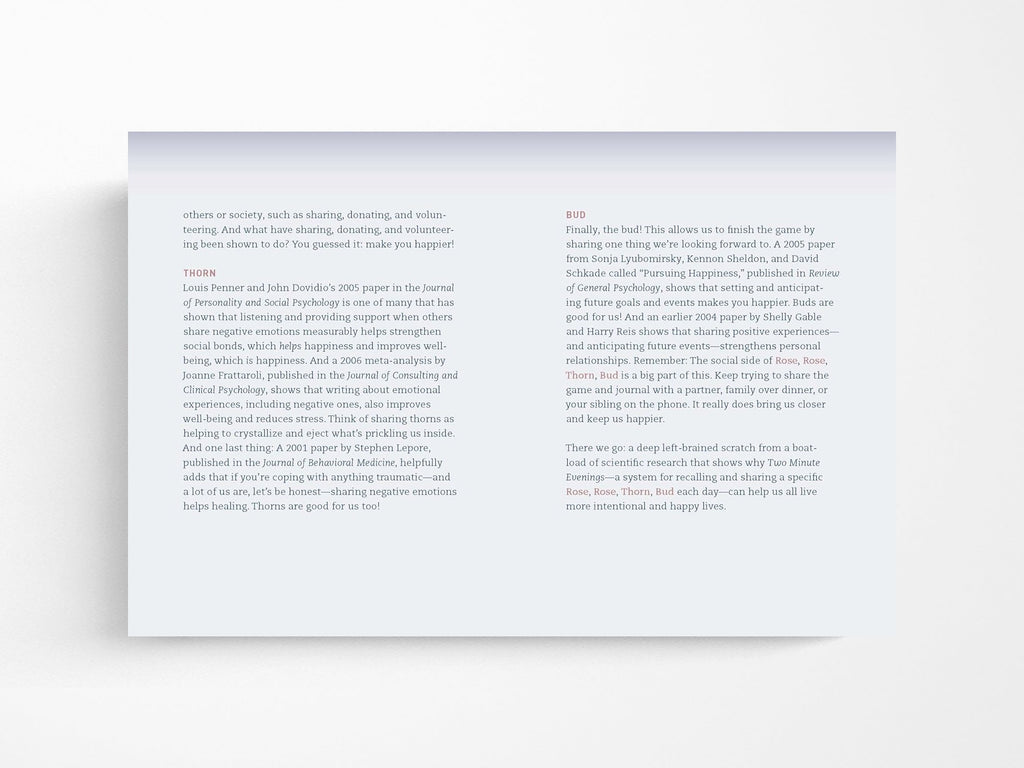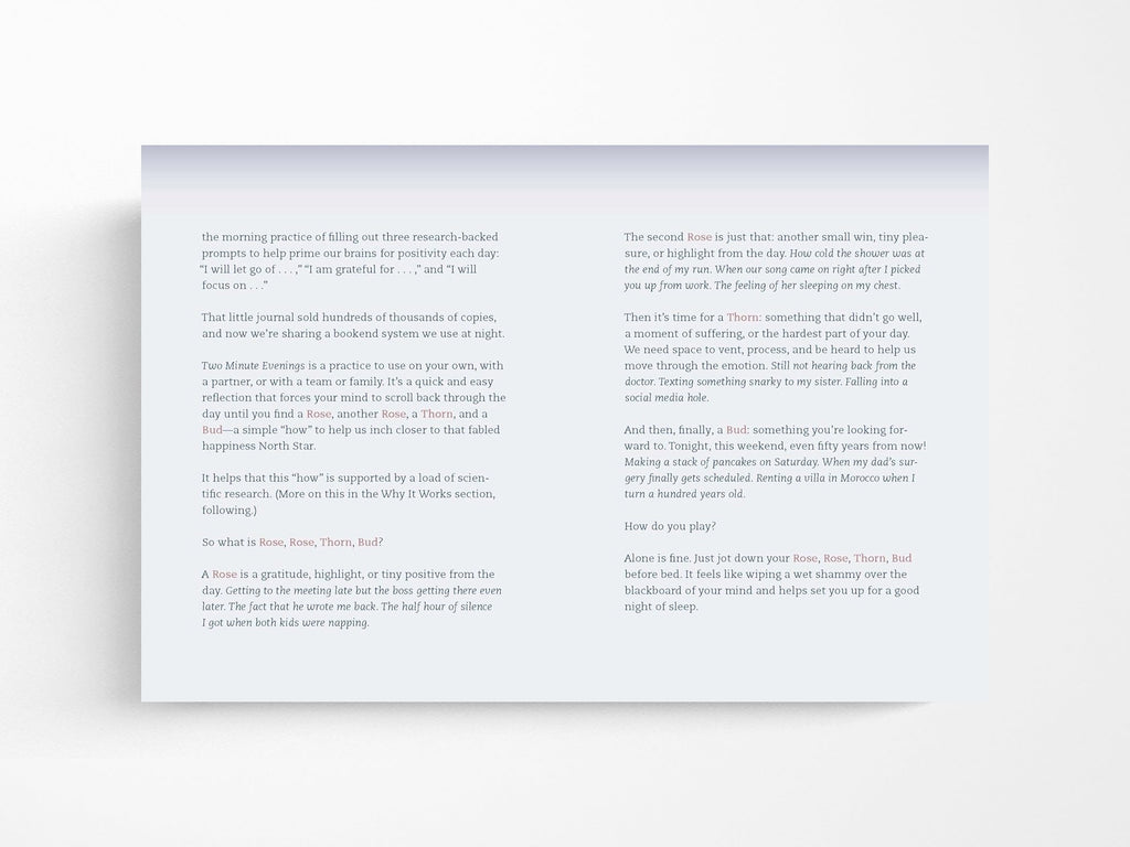 Establishing a gratitude practice is a simple habit that can have huge positive impacts on your life. Drawn from psychological research, Two Minute Evenings outlines a simple approach to use on your own, with a partner, or with a team or family. Taking just two minutes, it’s a quick and easy reflection that forces your mind to scroll back through the day until you find: