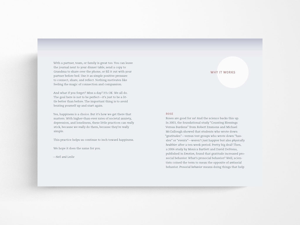 Created by Neil Pasricha and Leslie Richardson, the husband-and-wife team of entrepreneurs, podcasters, public speakers, and New York Times bestselling authors with millions of books sold worldwide, this guided journal prompts you into a quick two-minute evening ritual that focuses the mind and cultivates happiness.