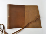 Our original Woodsman 3 ring binder is handcrafted of thick oiled cowhide that will develop a patina and age with you. The unstructured soft cover allows maximum flexibility. A thick contrasting leather strap ties around the binder to hold it closed and protect the contents. Authentic rugged charm...